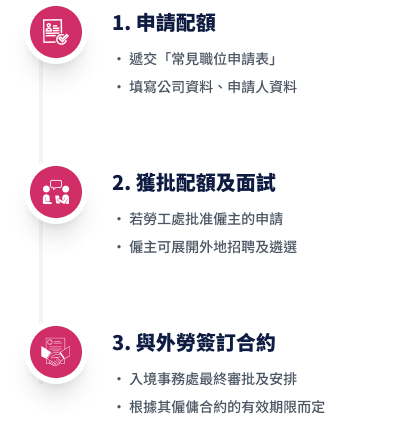 協助僱主與外勞雙方簽訂標準僱傭合約,並整合所有簽證申請文件,向入境處申請工作簽證。